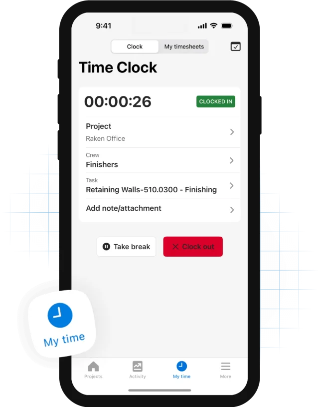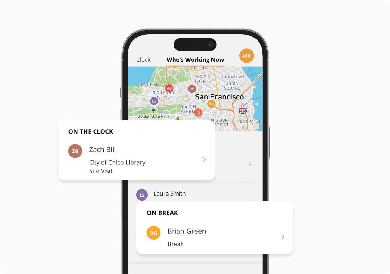 Clock In/Clock Out - Simple, intuitive clock-in process that works across all devices, making it easy for field workers to track their hours accurately.