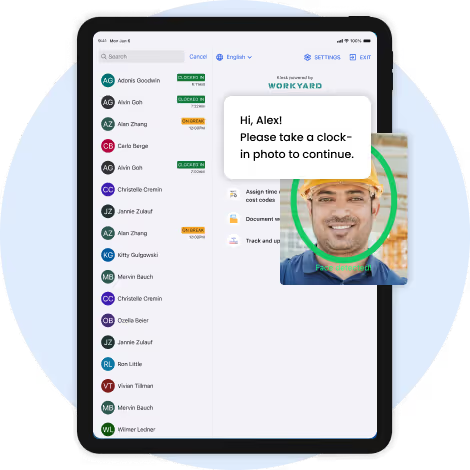 Kiosk Time Clock - Set up a shared tablet or device at the job site trailer where multiple crew members can clock in/out, ideal for larger job sites.